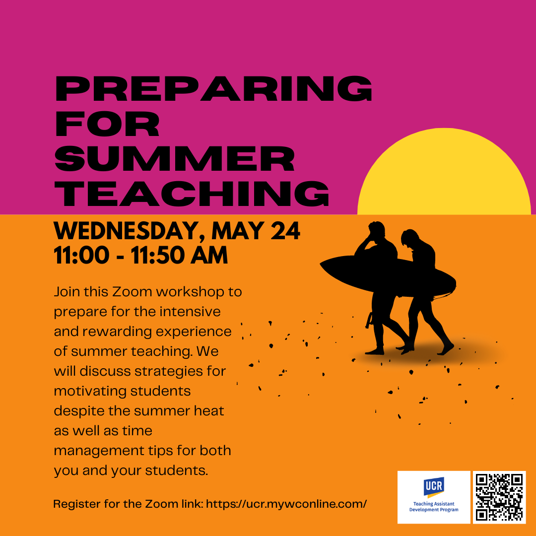 * Preparing for Summer Teaching, Wednesday, May 24th, 11-11:50AM, Zoom<https://tadp.ucr.edu/resources/workshops>.
