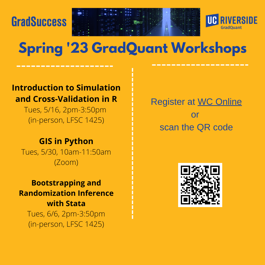 * Introduction to Simulation and Cross-Validation in R, Tuesday, May 16th, 2-4PM, LFSC 1425 and Zoom<https://ucr.zoom.us/j/94242979020>.