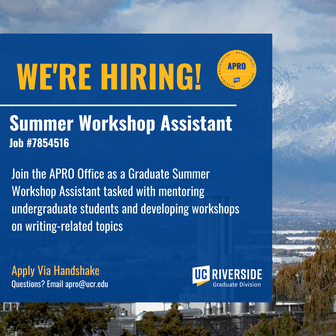 The APRO Office is hiring a Graduate Student Assistant for Summer 2023, and we were hoping you could spread the word and encourage any students in need of summer employment to apply! We are specifically looking for someone to run our writing workshops and help undergraduate students with their personal statements and other writing-related materials used to apply for grad school.