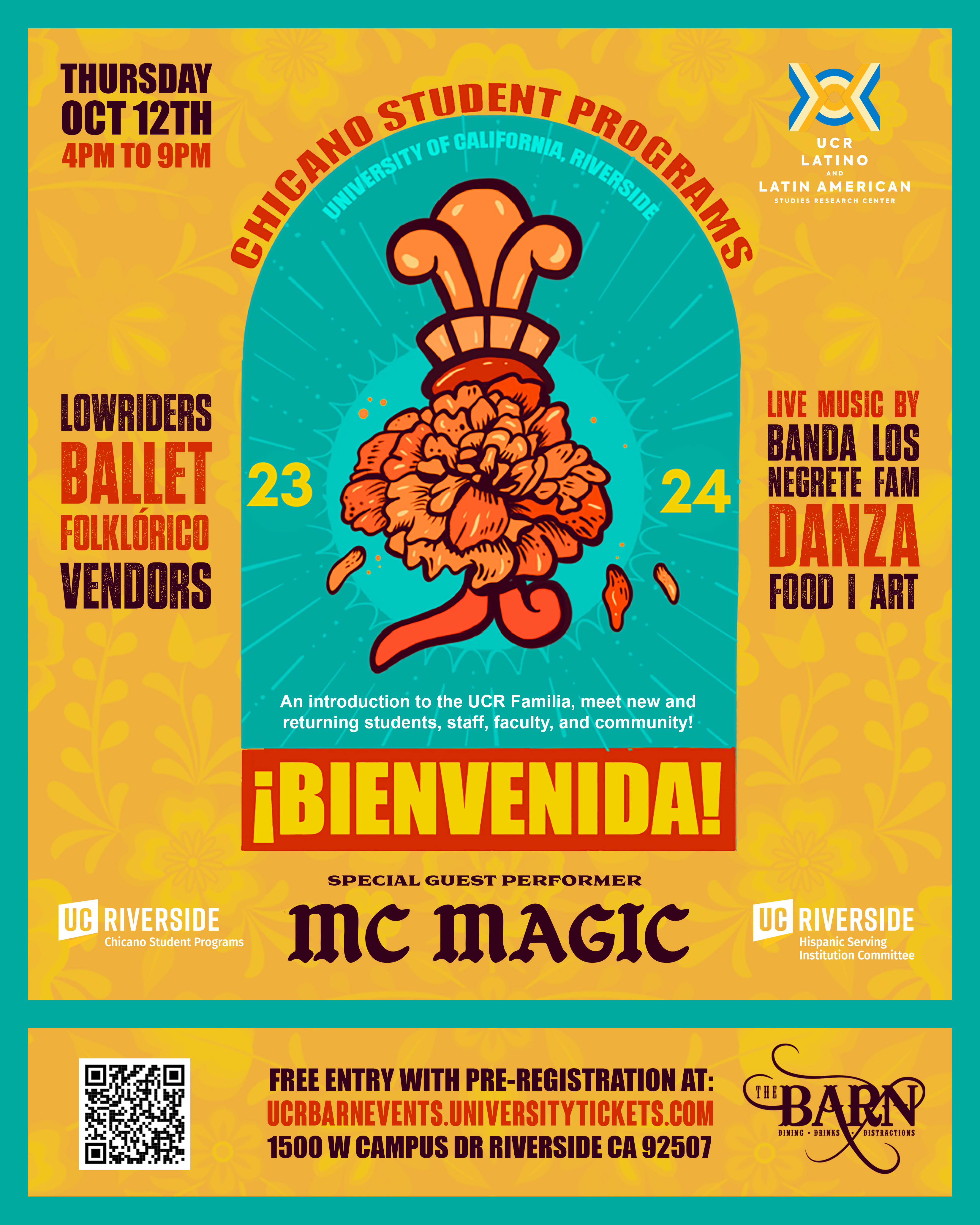 Join us for an evening of celebration as we welcome new and returning students, staff, faculty and community to campus. Event will include live music, art, cultural vendors, information tables, and performances by Danza Azteca Teocalli Tepeyolot, Ballet Folklorico de UCR, Banda Los Negrete Fam and MC MAGIC. Event is free with pre-registration at: ucrbarnevents.universitytickets.com<https://ucrbarnevents.universitytickets.com/>. Event is co-sponsored by UCR Hispanic Serving Institution Committee, UCR Latino and Latin American Studies Research Center, and The Barn.