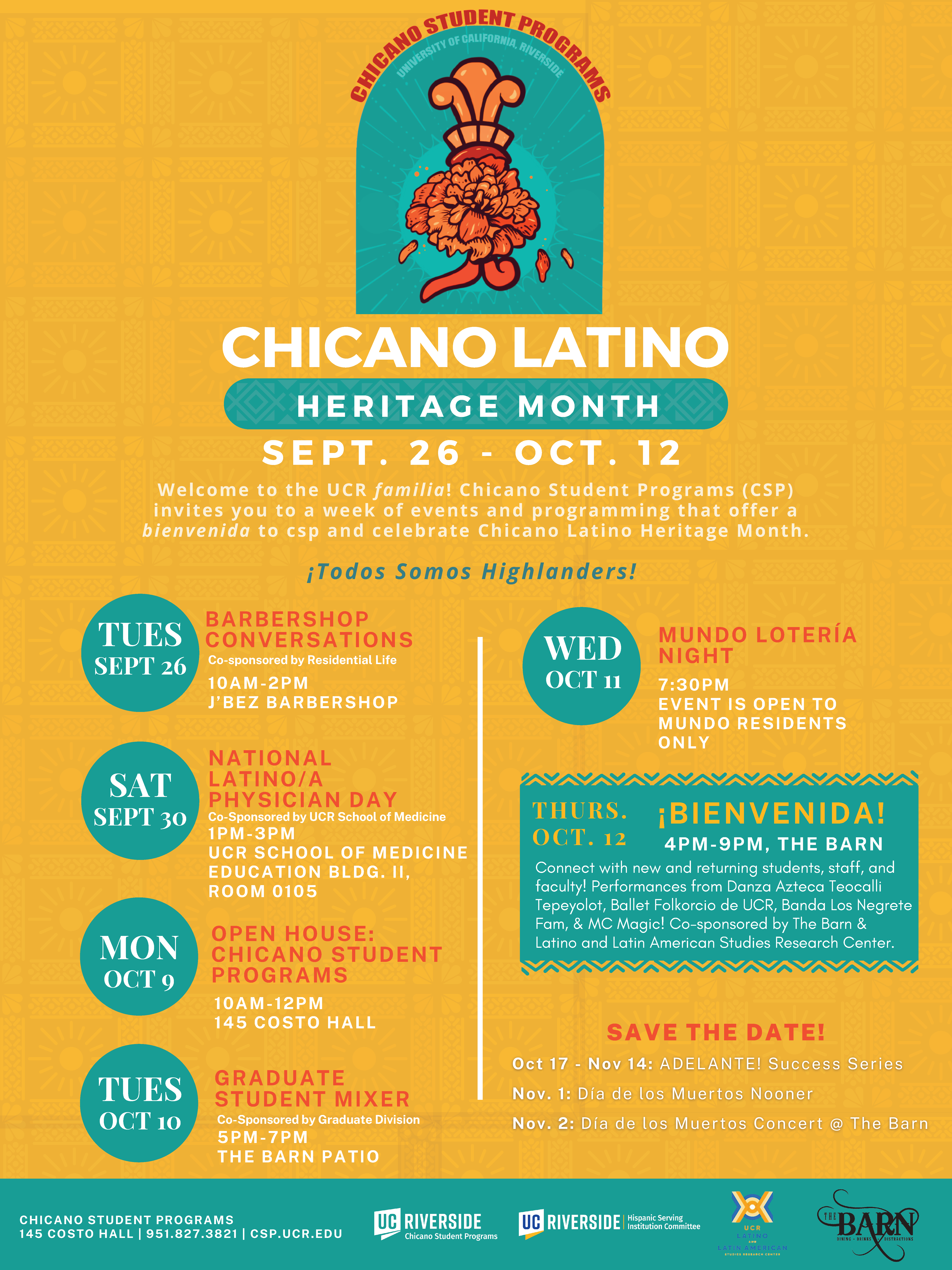 We welcome you the UCR familia and invite you to a month of events and programming that offer a bienvenida to CSP and celebrate Chicano Latino heritage.