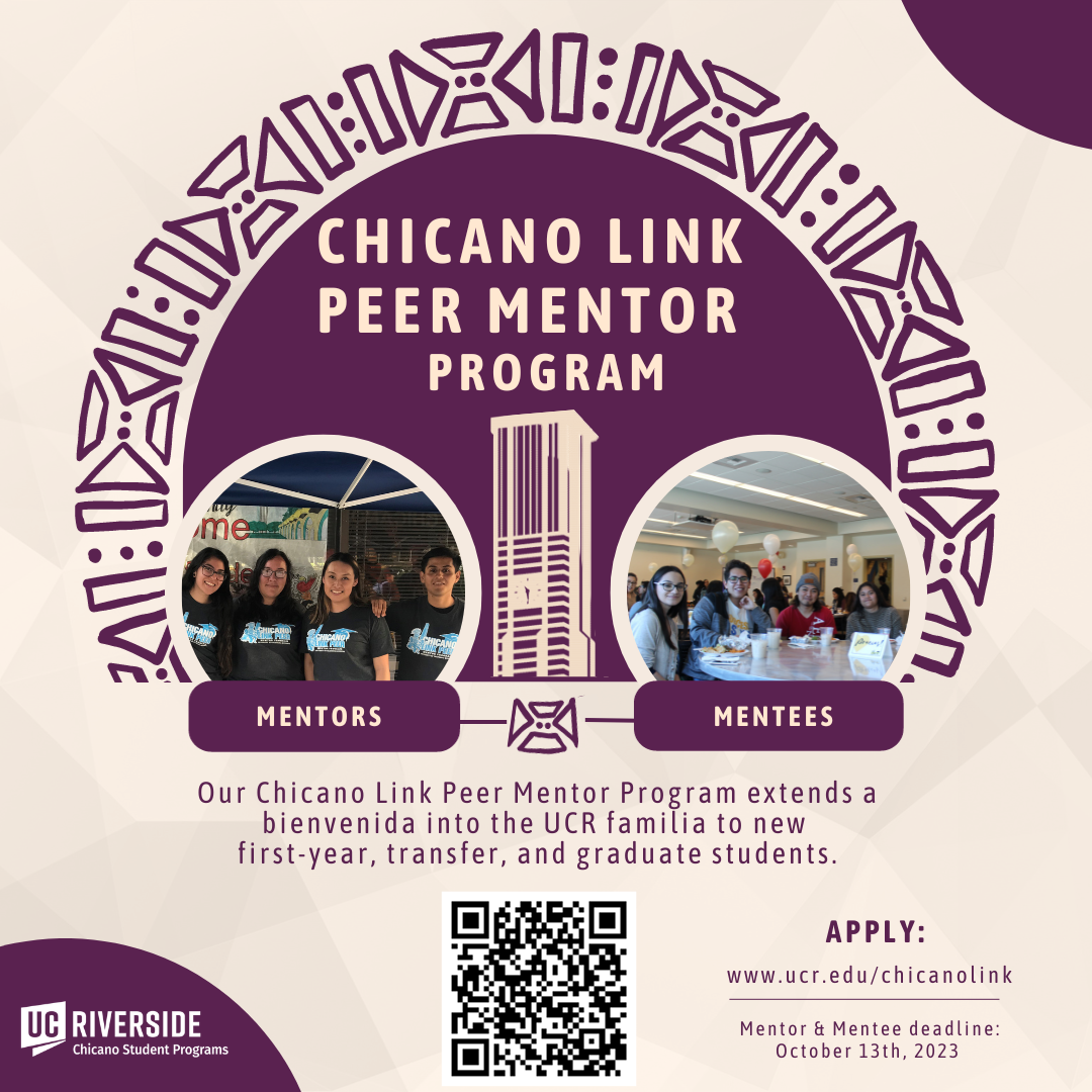 Our peer mentor program extends a bienvenida into the UCR familia to first-year, transfer and graduate students. One-on-one meetings, academic and culturally affirming workshops all support a positive transition to UCR. To apply visit go.ucr.edu/chicanolink.
