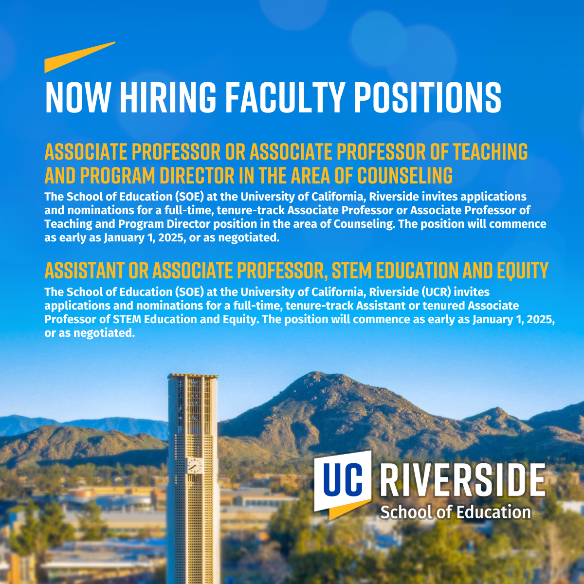 The SOE has two open faculty positions (see image below for details on positions). To aid in the marketing and advertising of these positions, we are asking if you could share the SOE LinkedIn post to your own account or even forward this message to anyone you may know that qualifies for and is interested in a faculty position. Here’s the UCR School of Education LinkedIn account: https://www.linkedin.com/company/ucrsoe/