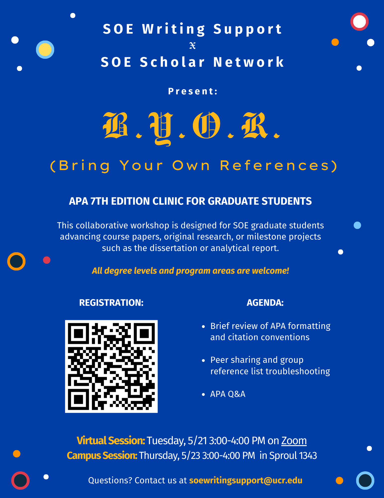 The SOE Writing Support and Scholar Network will be hosting two clinics on APA 7th Edition. The clinic is designed for SOE graduate students advancing course papers, original research, or milestone projects such as the dissertation or analytical report.
