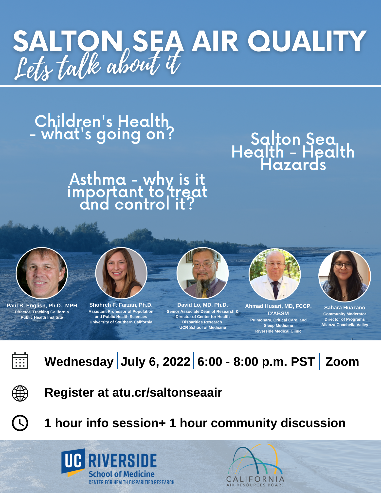 Join us on Wednesday, July 6th from 6:00 PM to 8:00 PM PST via Zoom for our virtual event (please see flyer attached for details). This event will include an info session from experts in the field discussing Salton Sea dust, the water and measured health issues in the area. There will also be a community discussion section for attendees to express their thoughts, questions and concerns.