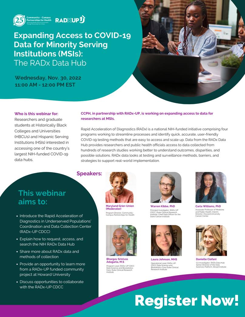 We invite you to participate in in the Expanding Access to COVID-19 Data for Minority Serving Institutions (MSIs): The RADx Data Hub this Wednesday, November 30th at 11:00 am EST.