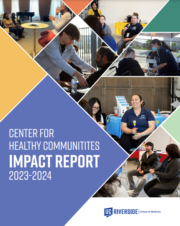 The Center for Healthy Communities is excited to present our 2023/2024 Impact Report<https://online.fliphtml5.com/jgove/fssr/#p=1>, showcasing our unwavering commitment to engaging with the community and forming partnerships and collaborations to create a positive impact on the lives of those we serve through our three pillars: Service, Education, and Research. We invite you to view the impactful report by visiting healthycommunities.ucr.edu.<https://healthycommunities.ucr.edu/>