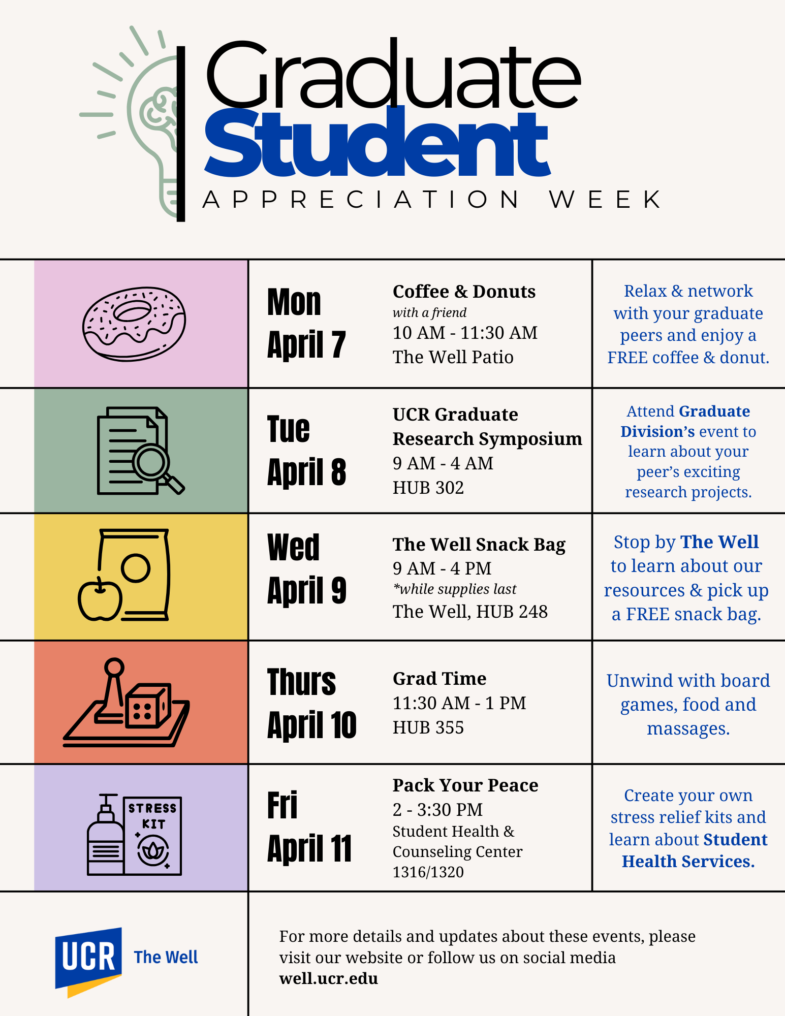 The Well is happy to announce our programming for Graduate Student Appreciation Week, April 7th - April 11th.
