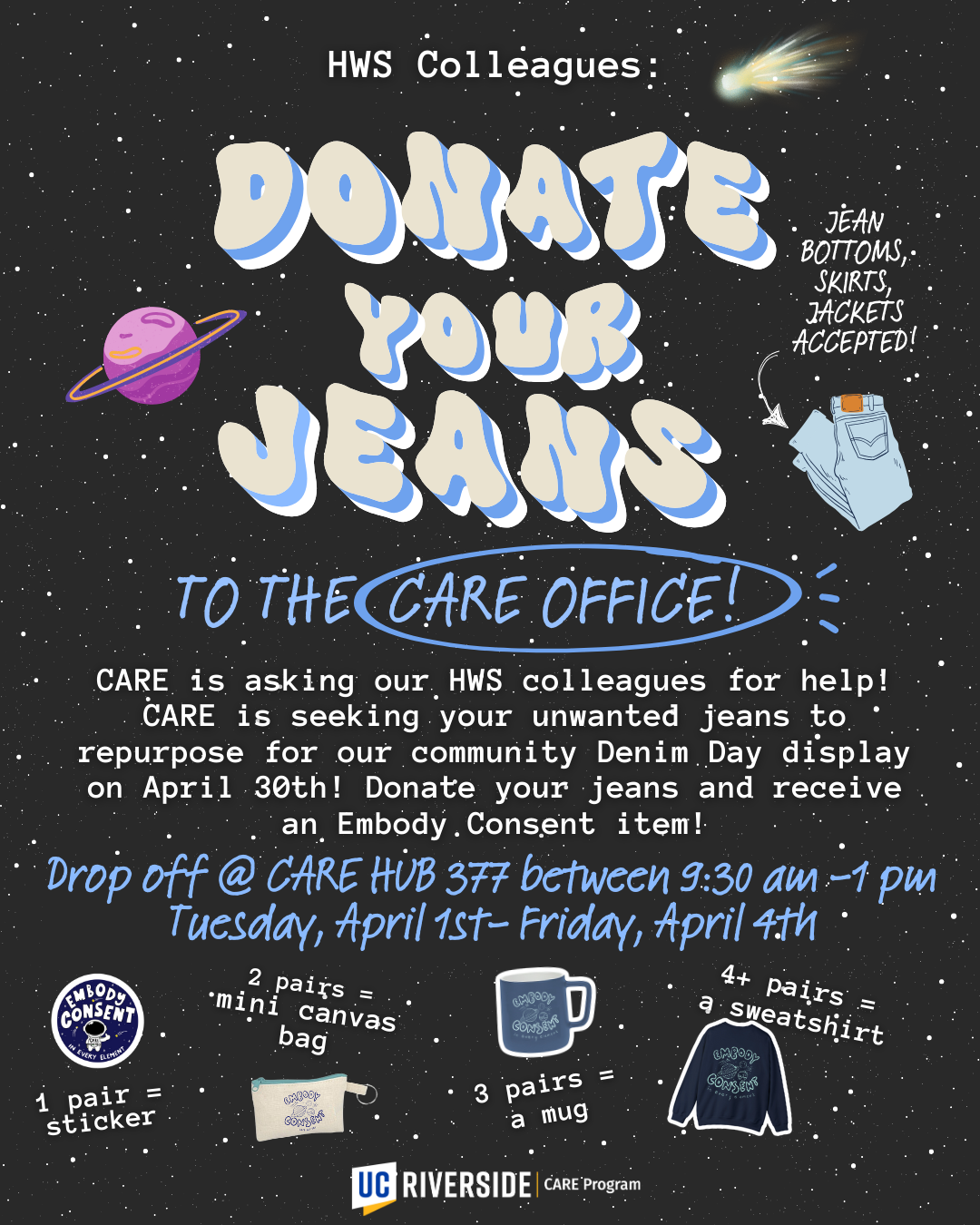 CARE is seeking jean donations to repurpose for our Denim Day<https://denimday.org/> community display at the Bell Tower on April 30th! Donate your jeans, and as a thank you, receive a CARE Embody Consent giveaway! We’re accepting jean pants, skirts, jackets, etc. We’re taking donations next week during week 1 of Spring Quarter: drop off @ CARE’s office Highlander Union Building HUB 377 from Tuesday, April 1st – Friday, April 4th between 9:30 am – 1 pm. And we welcome y’all to join us during April for our programs and community events!