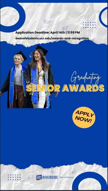 Apply here: Graduating Senior Awards<https://deanofstudents.ucr.edu/awards-and-recognition>