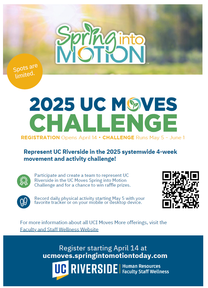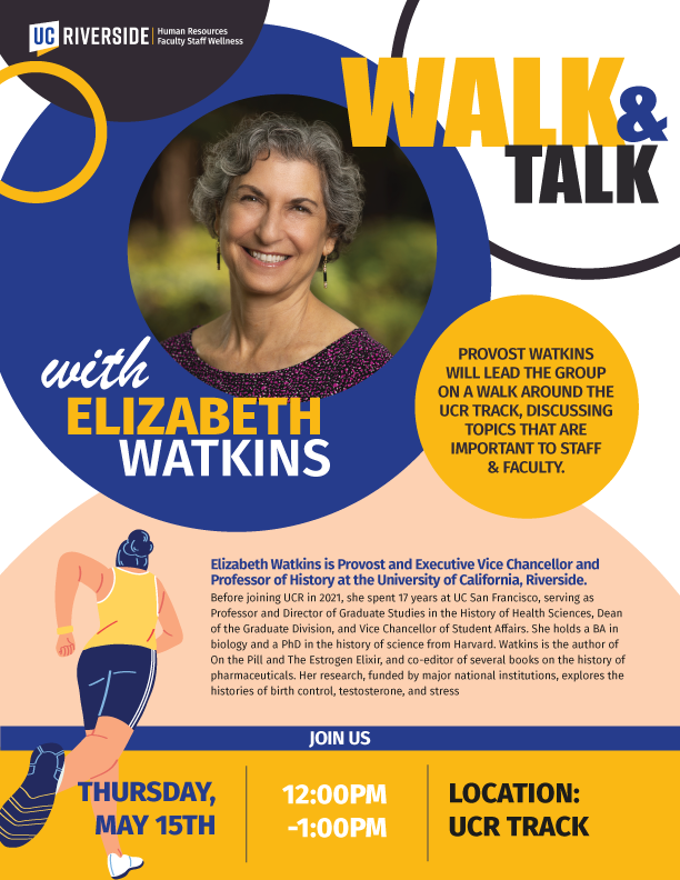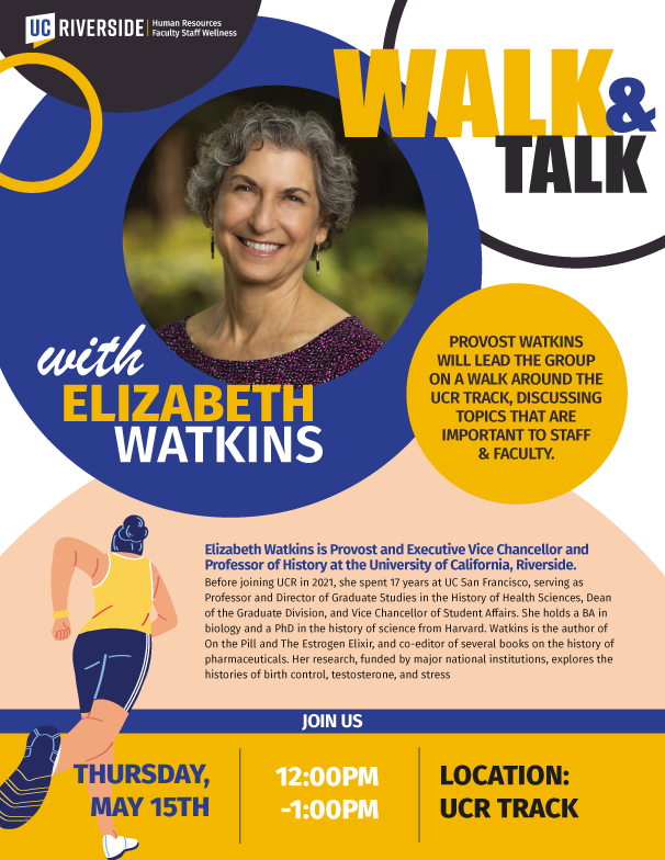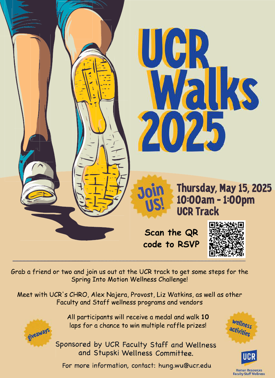 Also, on April 15, join Provost Liz Watkins and CHRO Alex Najera for UCR Walks! These are great opportunities to participate in campus-wide health and wellness initiatives.