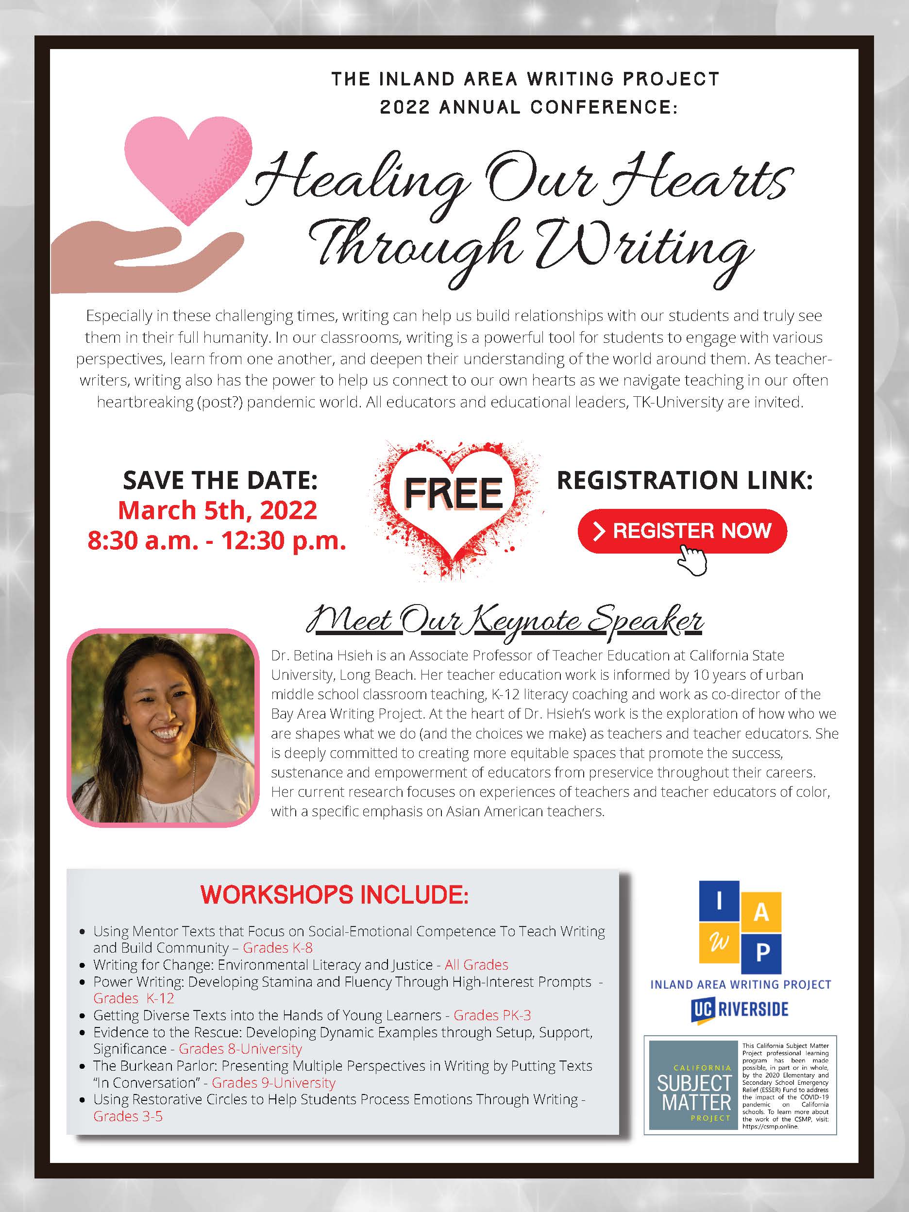 Join us for our virtual Inland Area Writing Project Conference that will include interactive workshops developed by educators and that focus on effective writing instruction for all learners. More information is available in the flyer attached to this email.