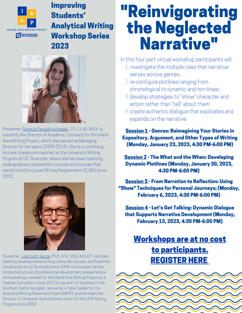 Details and session descriptions can be found on the attached flyer and on our event webpage<https://iawp.ucr.edu/event-list/2023/01/23/improving-students-analytical-writing-2023-workshop-series>. Sessions will be offered via Zoom throughout January and February.