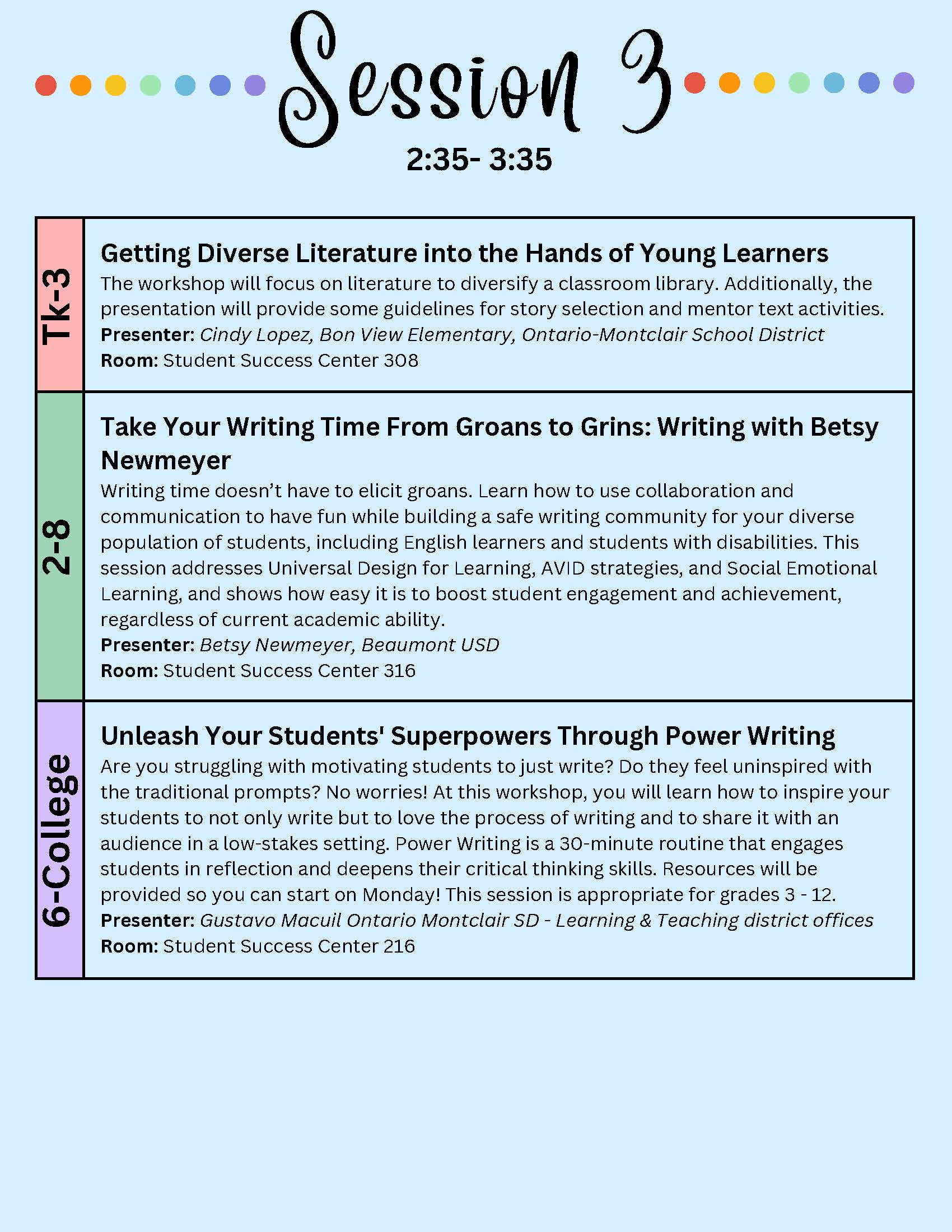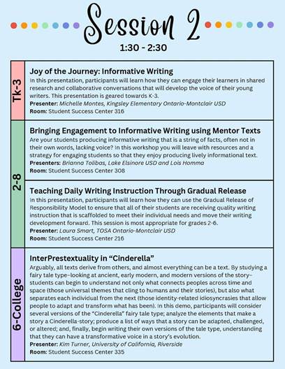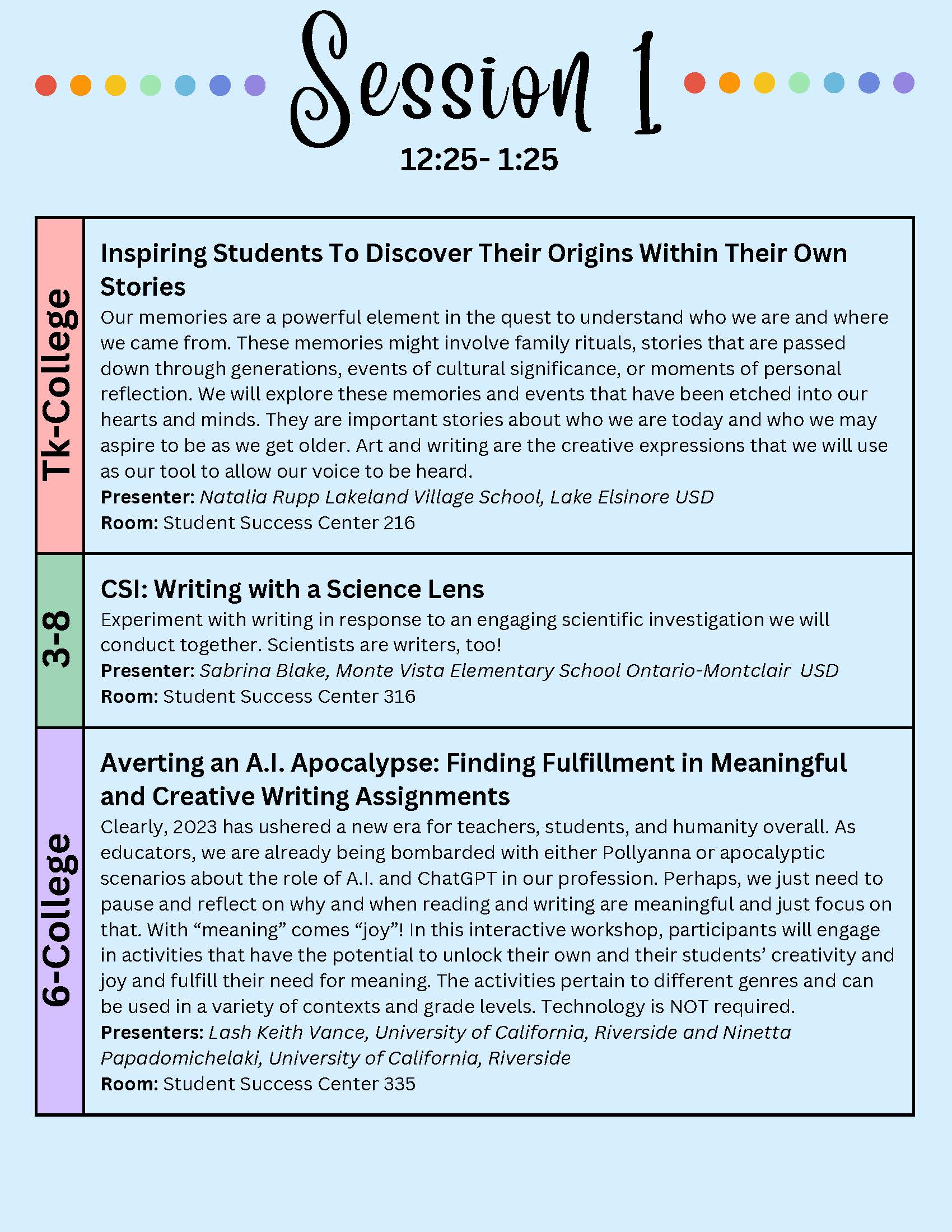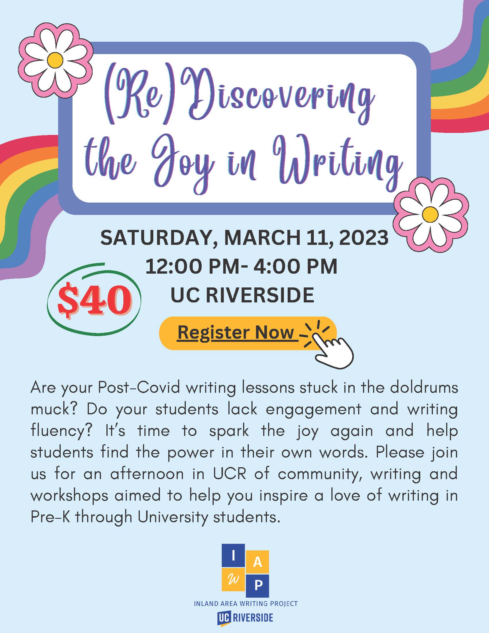 Hello - Join us for the in-person Inland Area Writing Project Conference that will include interactive workshops developed by educators that focus on effective writing instruction for all learners. More information is listed in the IAWP Conference brochure below, in the attached flyer, and at the following IAWP conference webpage link: https://iawp.ucr.edu/event-list/2023/03/11/inland-area-writing-project-conference-2023