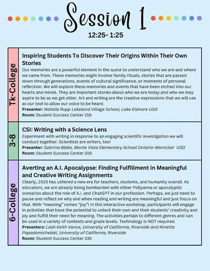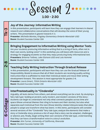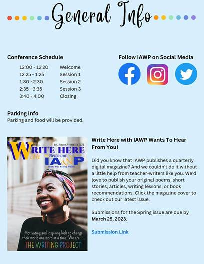 Hello – Join us for the in-person Inland Area Writing Project Conference that will include interactive workshops developed by educators that focus on effective writing instruction for all learners. More information is listed in the IAWP Conference brochure below, in the attached flyer, and at the following IAWP conference webpage link: https://iawp.ucr.edu/event-list/2023/03/11/inland-area-writing-project-conference-2023
