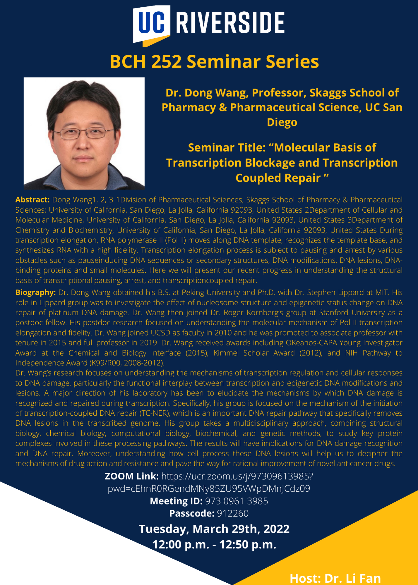 [IIGB_All] BCH 252 Seminar Series Spring 2022 - Dr. Dong Wang UC San Diego 3/29/2022 12:00pm