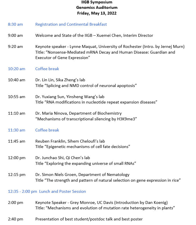 This is a final call to register for the In-Person IIGB Symposium being held on Friday, May 13, 2022, from 8:30 am – 3:00 pm. The theme for this year’s symposium is “genome, epigenome and RNA”. This year’s keynote speakers are Lynne Maquat from the University of Rochester and Grey Monroe from UC, Davis.