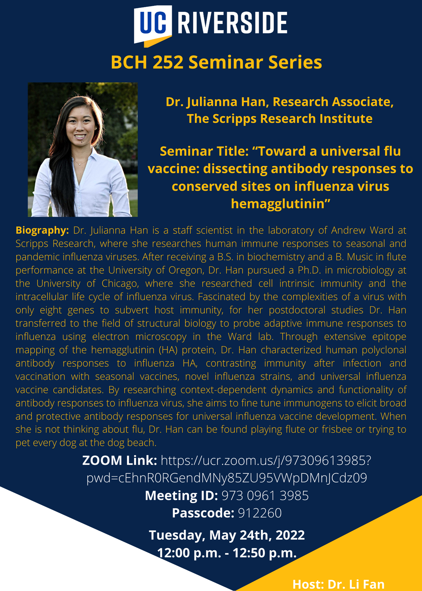 [IIGB_All] BCH 252 Seminar Series Spring 2022 - Dr. Julianna Han The Scripps Research Institute 5/24/2022 12:00pm