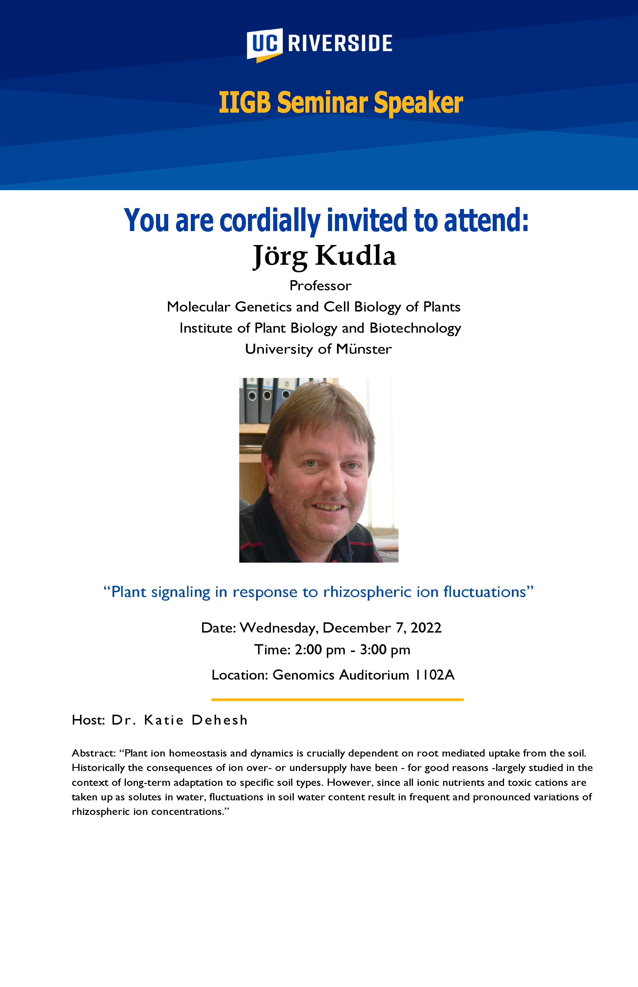 We invite you to attend a seminar presented by Dr. Jörg Kudla Professor of Molecular Genetics and Cell Biology of Plants from the University of Münster. The seminar will be on December 7th from 2 pm-3 pm in the Genomics Auditorium.