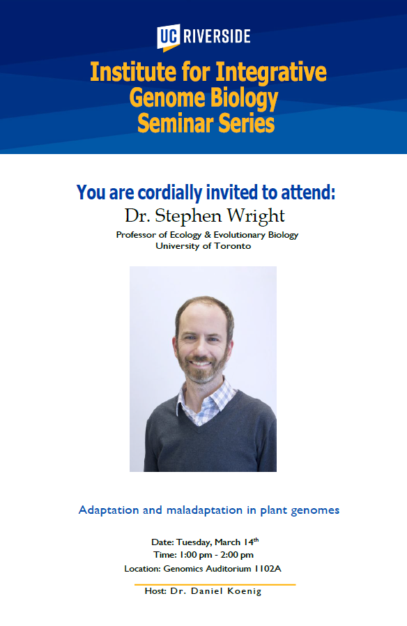 * Tuesday March, 14: Dr. Stephen Wright "Adaptation and maladaptation in plant genomes", hosted by Dr. Koenig
