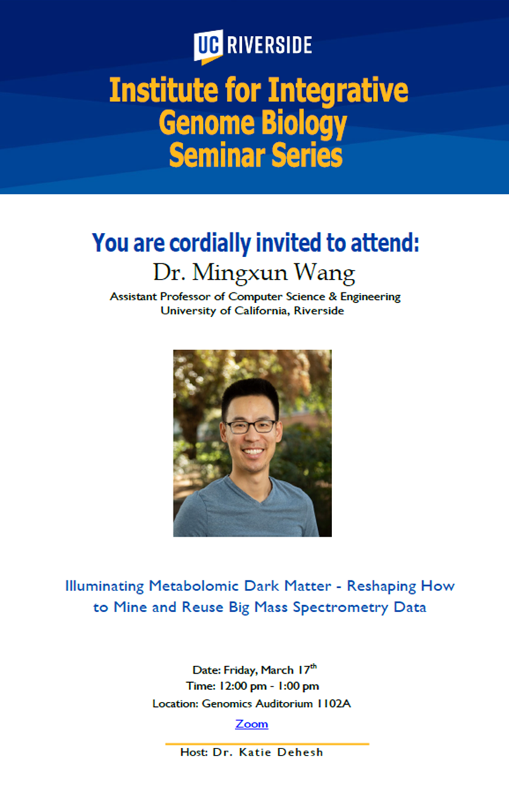 * Friday March, 17: Dr. Mingxun Wang "Illuminating Metabolomic Dark Matter - Reshaping How to Mine and Reuse Big Mass Spectrometry Data", hosted by Dr. Dehesh
