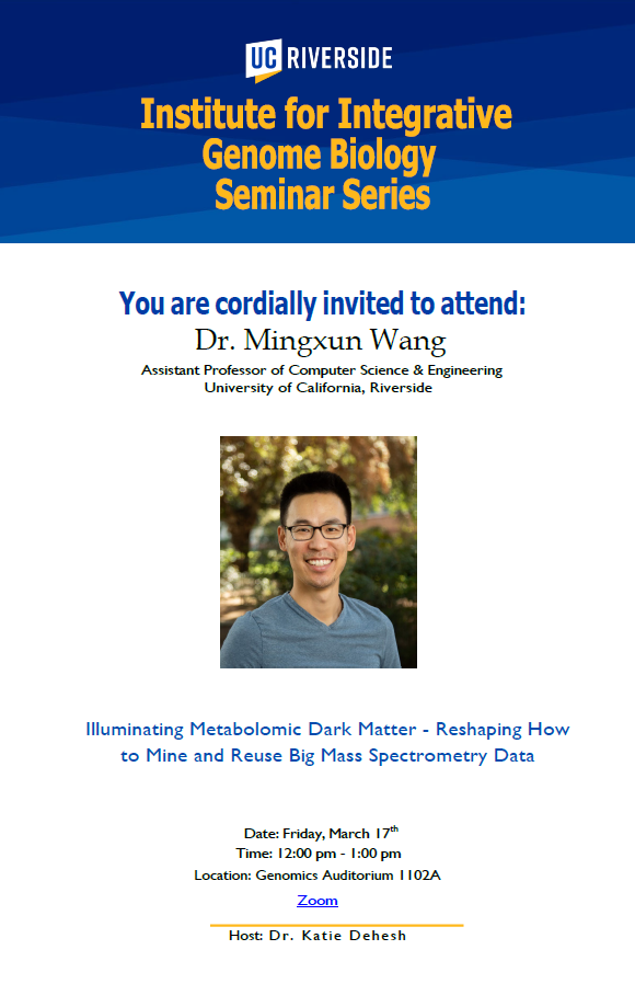 A reminder that Dr. Dehesh will be hosting Dr. Mingxun Wang for a noon IIGB seminar this Friday. This seminar is also being held virtually<https://ucr.zoom.us/j/91014677899?pwd=UVB5WkFEWmFvYXp5RitoZ0xyQmUzZz09>.