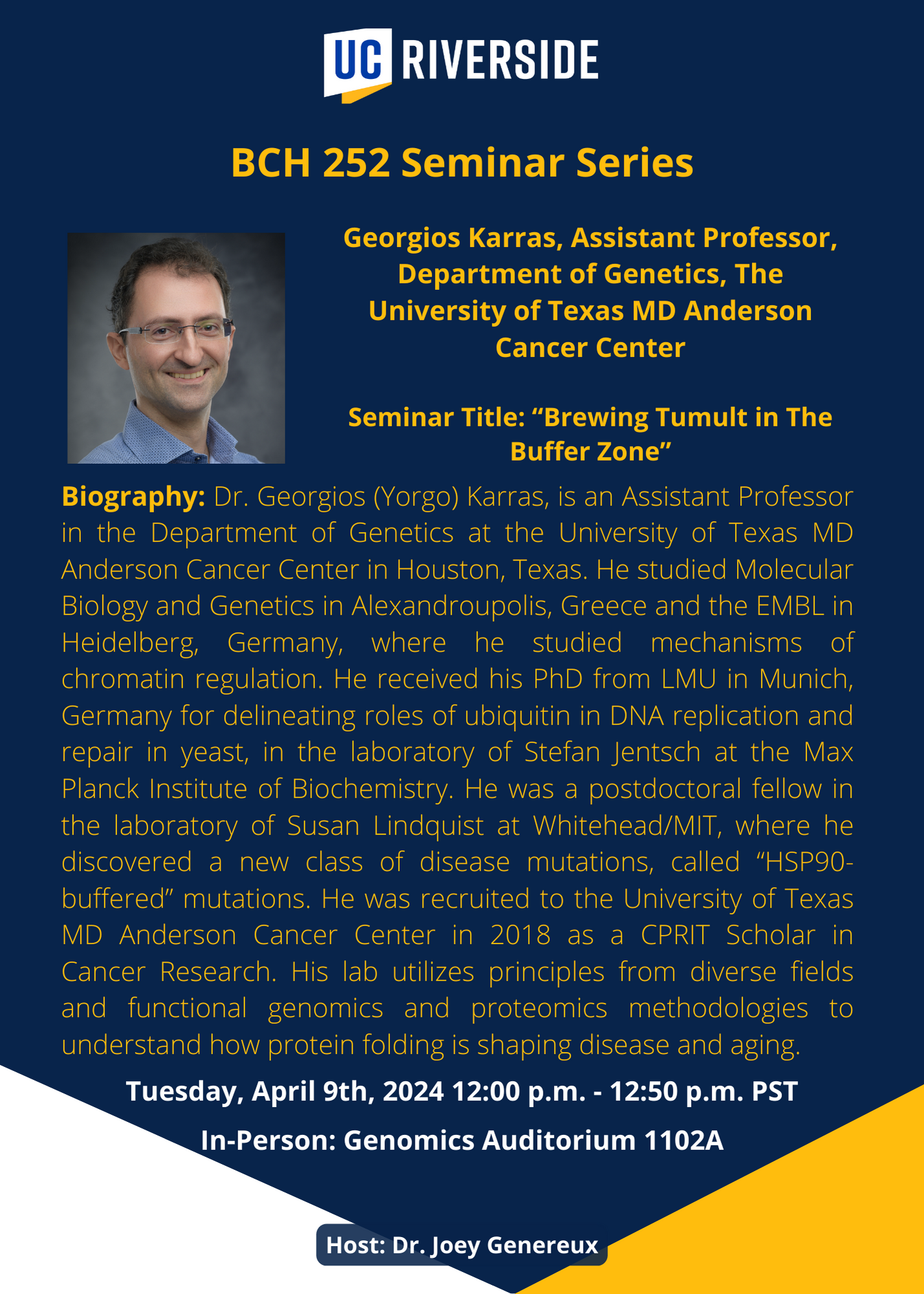 [IIGB_All] BCH 251/252 Seminar Series Spring 2024 - Dr. Georgios Karras, The University of Texas, MD Anderson Cancer Center 4/9/2024 12:00pm