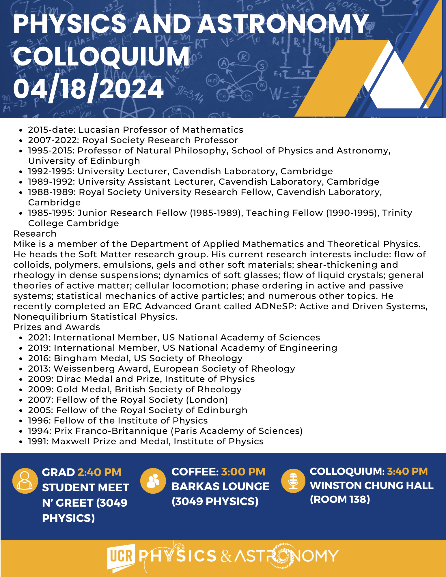 Professor Michael Cates, a prominent soft condensed matter/Biophysicist will give the physics colloquium next week. The poster of his talk is below.