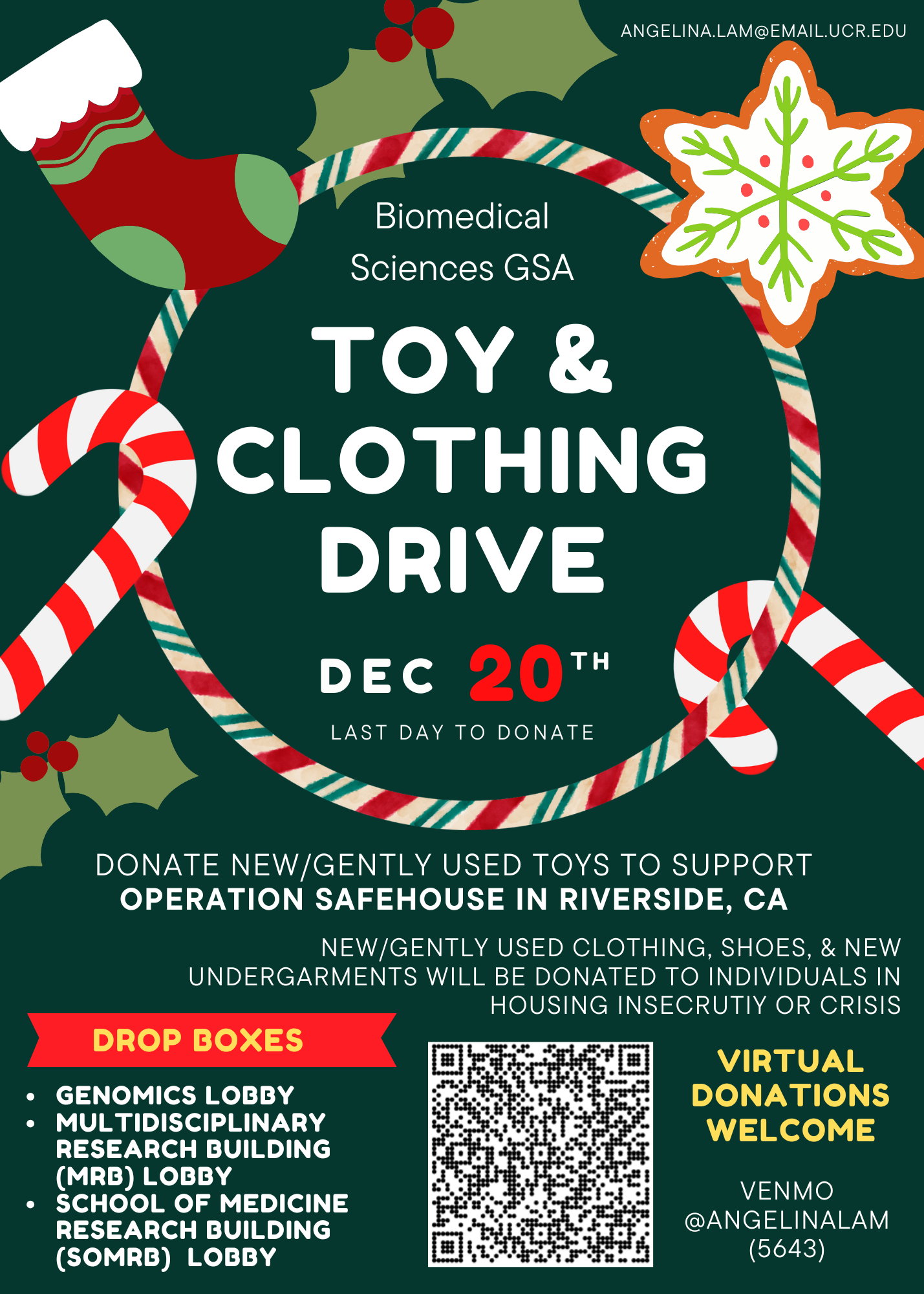I hope this message finds you well! As part of our final initiative to support our local community this holiday season, the Biomedical Sciences GSA has organized a toy and clothing drive to gather new or gently used toys and/or clothing to support individuals and families who may be facing challenging circumstances.