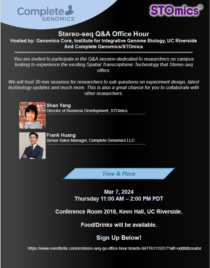 We would like to invite you to the Complete Genomics Stereo-seq Q&A Office Hour happening on March 7th, 11 AM - 2 PM at the Genomics Core conference room 2018.