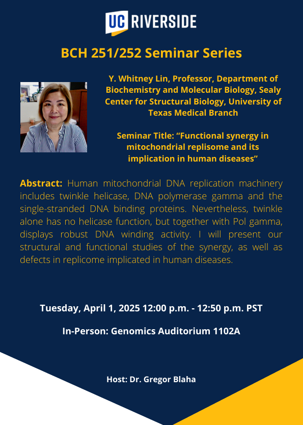 [IIGB_All] REMINDER - BCH 251/252 Seminar Series Spring 2025 - Y. Whitney Yin, University of Texas [TODAY] 4/1/2025 12:00pm