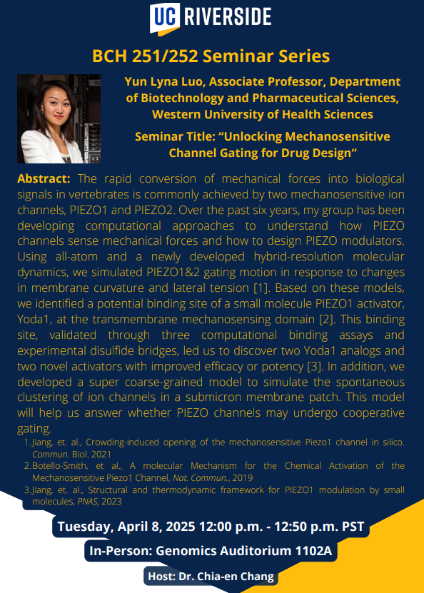 [IIGB_All] REMINDER - BCH 251/252 Seminar Series Spring 2025 - Yun Lyna Luo, Western University of Health Sciences [TODAY] 4/8/2025 12:00pm