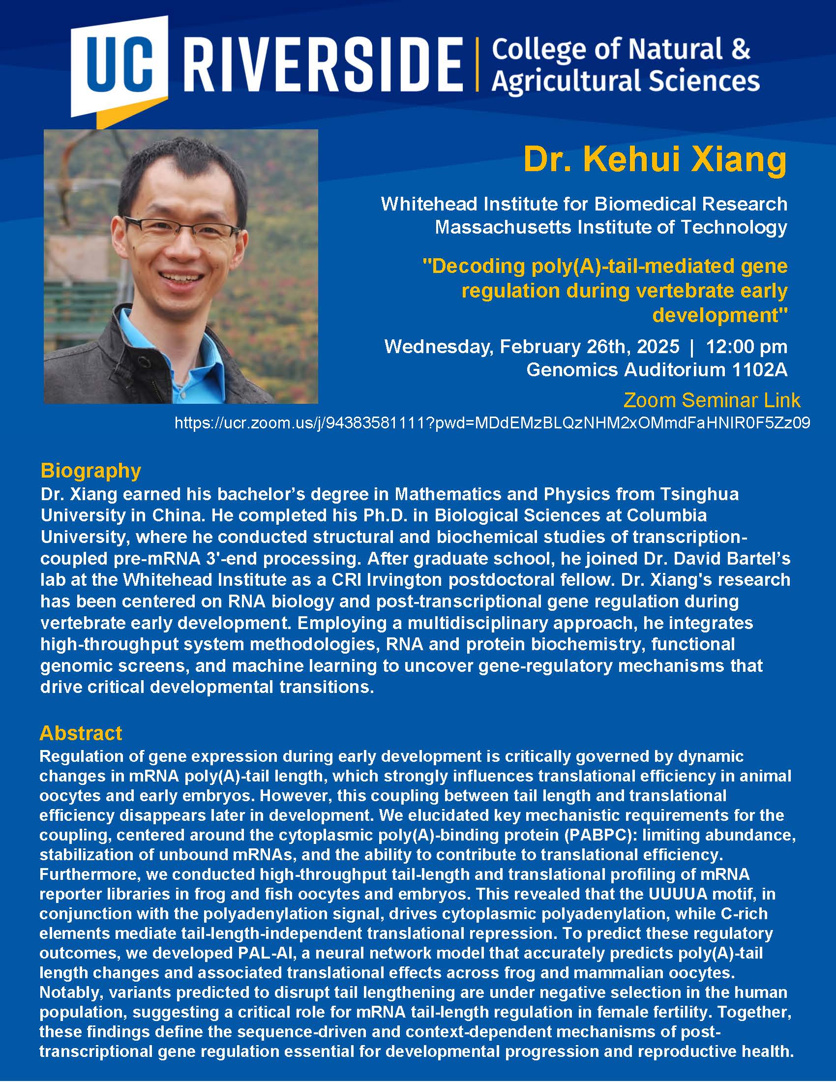 [IIGB_All] Fwd: CMDB/GGB/MCBL Seminar: Dr. Kehui Xiang - Wed., 2/26/25, In Person, Genomics Auditorium 1102A