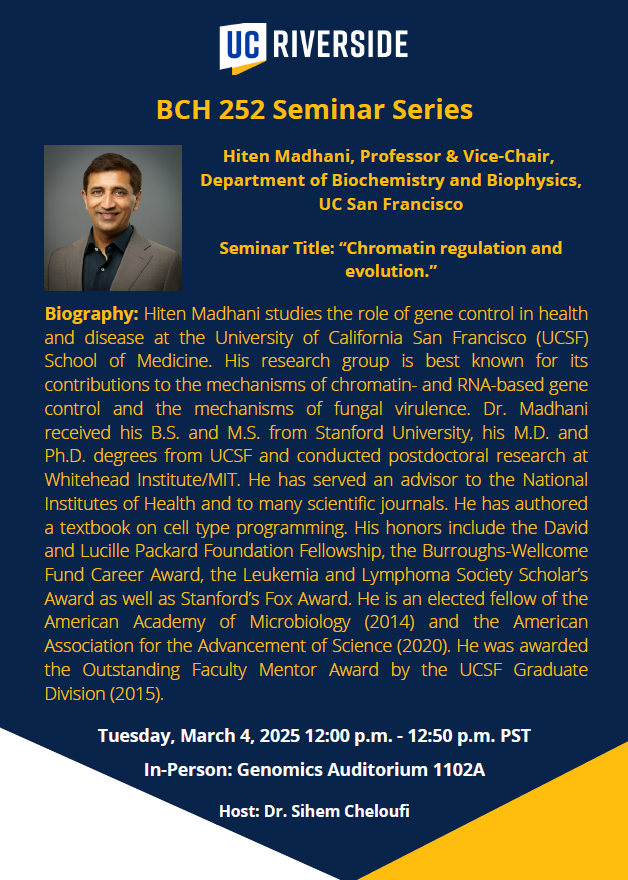 Subject: BCH 251/252 Seminar Series Winter 2025 - Hiten Madhani, UC San