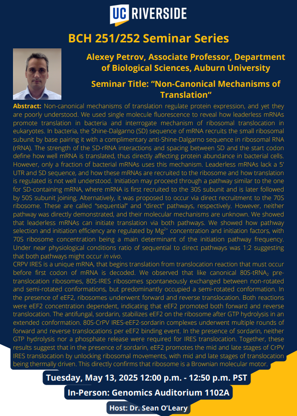 [IIGB_All] REMINDER - BCH 251/252 Seminar Series Spring 2025 - Alexey Petrov, Auburn University [TODAY] 5/13/2025 12:00pm