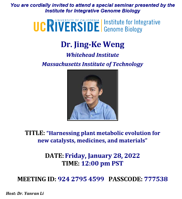 [IIGBCORES_All] Today at Noon: IIGB Seminar: Jing-Ke Weng - Friday, January 28, 2022