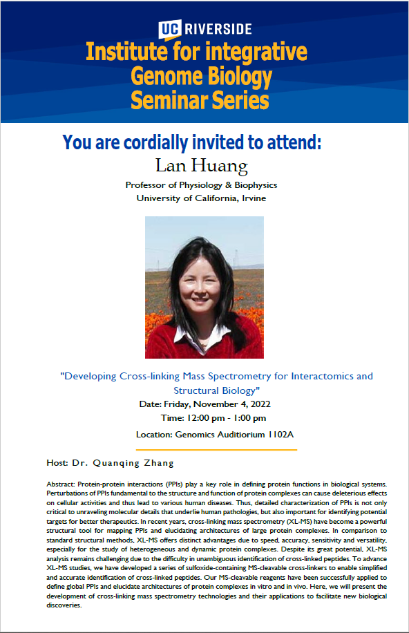 This Friday November 4th, our Proteomics Core manager Dr. Quanqing Zhang will be hosting Dr. Lan Huang from UC Irvine for a noon seminar. The title of this talk is “Developing Cross-linking Mass Spectrometry for Interactomics and Structural Biology". Please join us in the Genomics auditorium 1102A for this event.