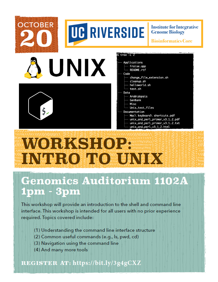 A reminder that Brandon and the Bioinformatics Core are hosting the Intro to Unix - Part I workshop tomorrow, Thursday, October 20th from 1 pm-3 pm in the Genomics auditorium. Please see the attached flyer for details and register here<https://bit.ly/3g4gCXZ> for the event.