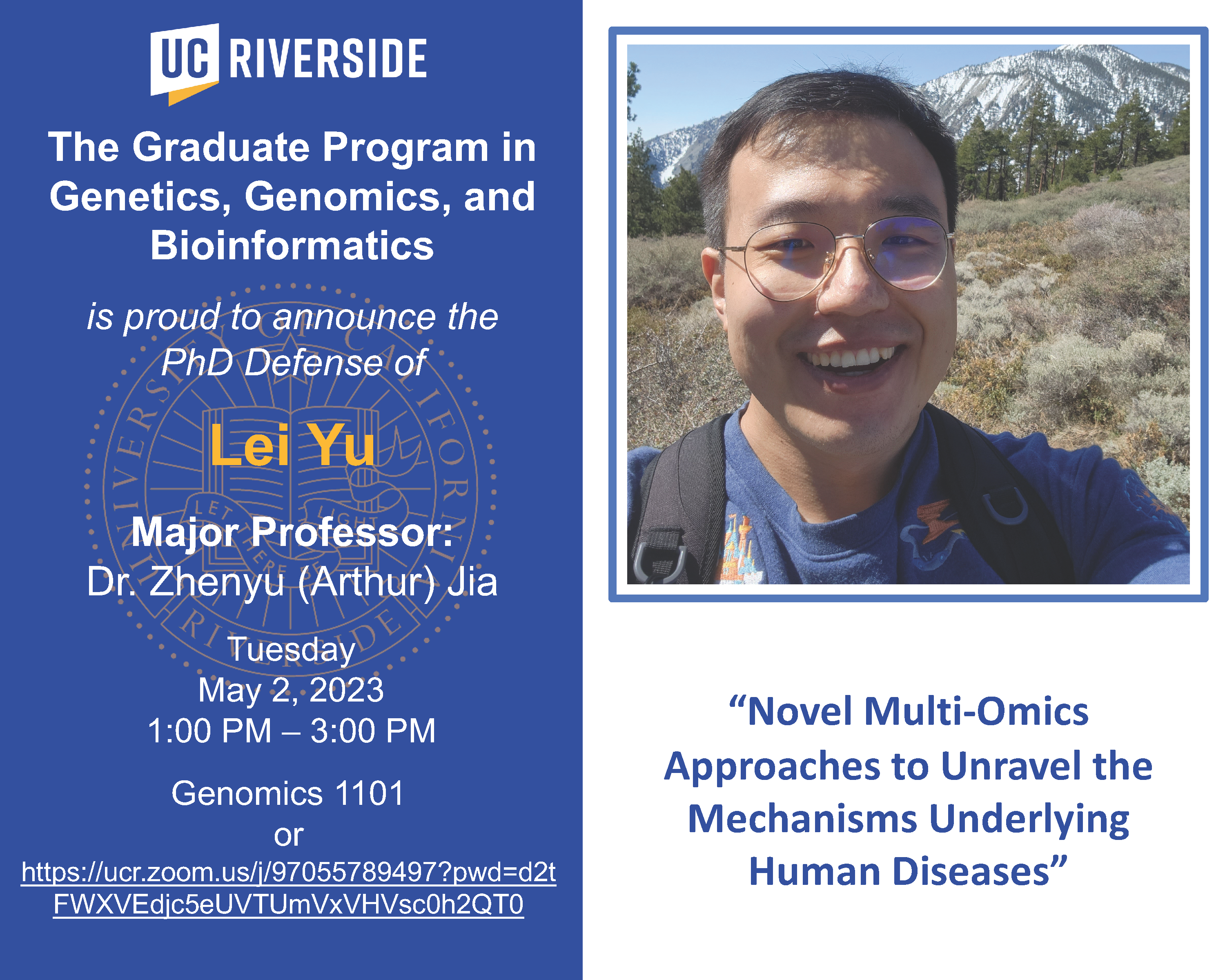[Lilab] Fwd: [Ggbfaculty] PhD Dissertation Defense Announcement: Lei Yu, May 2, 2023