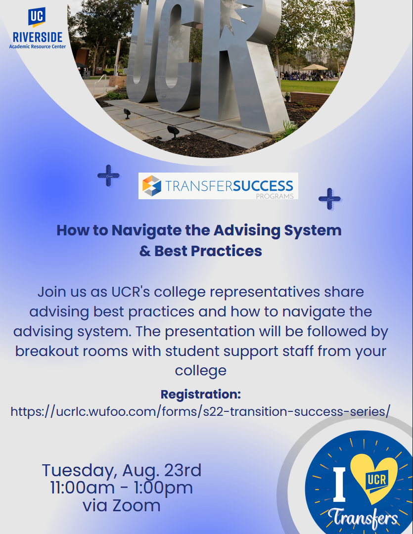 Are you interested in preparing for your advising sessions this upcoming year? Would you like to learn how to navigate the advising system. Do you want to gain knowledge on best practices for your advising sessions? Then join the Transfer Success Program on Tuesday, August 23rd from 11:00am - 1:00pm via Zoom for a presentation on How to Navigate the Advising System & Best Practices. The presentation will be followed by an opportunity to learn about student support services from your respective colleges via breakout rooms.