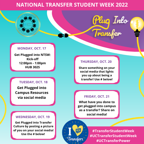 Join us from October 17th - 21st for National Transfer Student Week as we celebrate our UCR transfer students while highlighting their accomplishments! Each day this week, we will get students 'plugged in' to transfer resources and supports. We invite you to jump start the week at the Kick-off event! Continue the celebration by participating in our social media campaign throughout the week! Check out the flyer to see ways that you could "plug into transfer!"