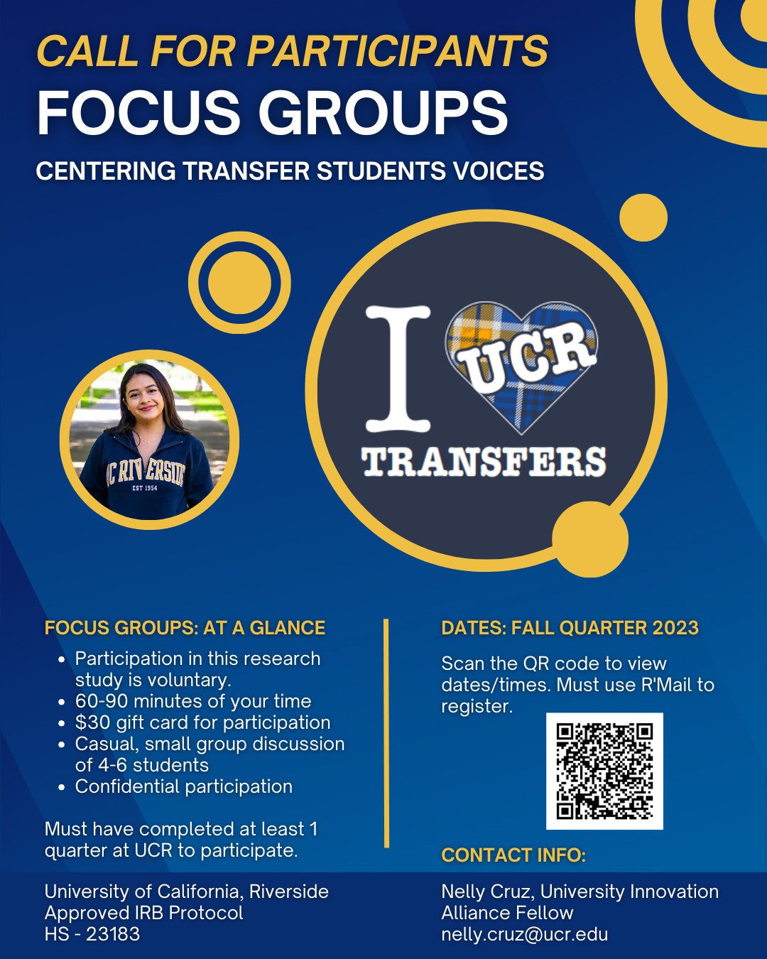 Share your insight as a transfer student during a 60-90 minute confidential discussion with 3-4 other students and get a $30 gift card. Register for one of three virtual sessions<https://forms.gle/s5uM2HTfSsafAf1v5>.