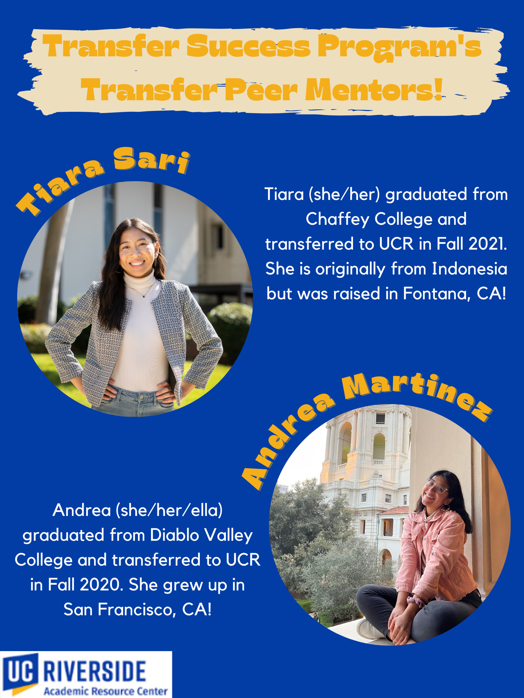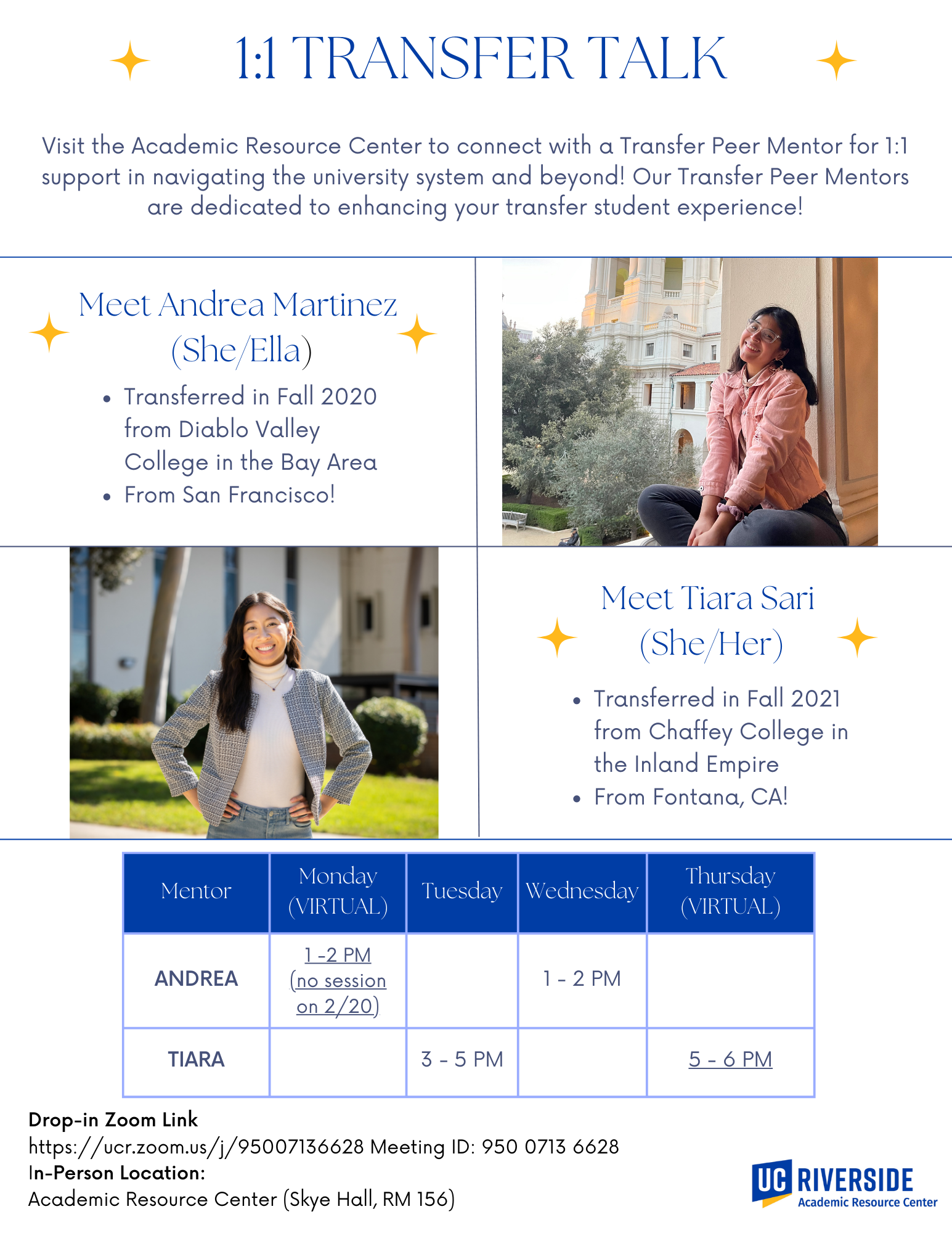 You can also stop by and connect with the Transfer Peer Mentors during their tabling hours located outside the Academic Resource Center. Stop by and gather more information about the Transfer Success Program and Academic Resource Center services!