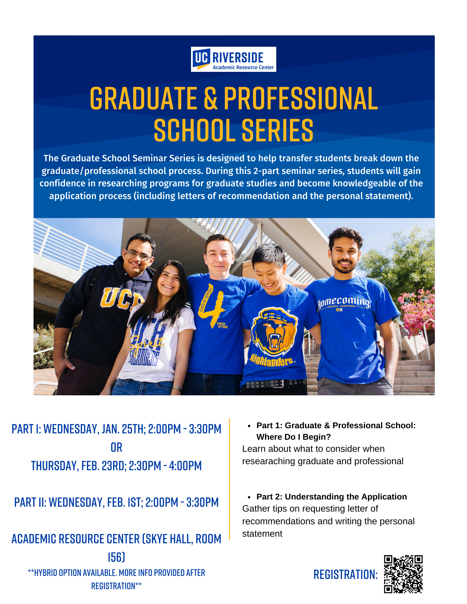 This graduate school seminar series is designed to help transfer students break down their graduate/professional school process. During this 2-part series, students will gain confidence in researching programs for graduate studies and become knowledgeable of the application process (including letters of recommendations and the personal statement).