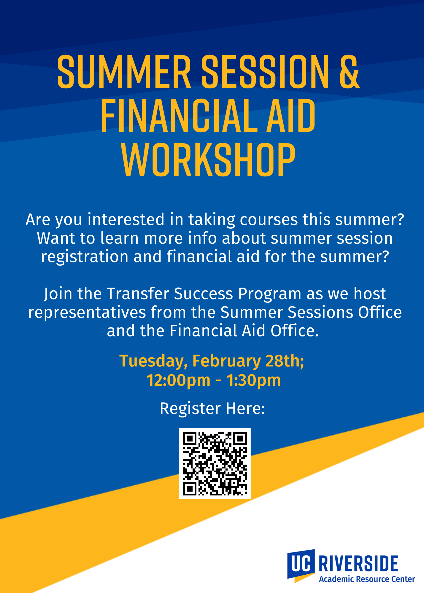 Interested in taking summer session courses at UCR? Join our workshop and gather information about the process from Summer Sessions and Financial Aid Office representatives.