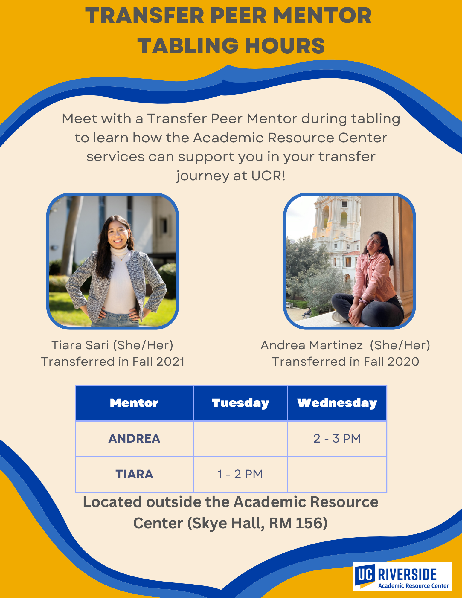 Meet with a Transfer Peer Mentor during tabling hours to learn how the Academic Resource Center services can support you in your transfer journey at UCR!