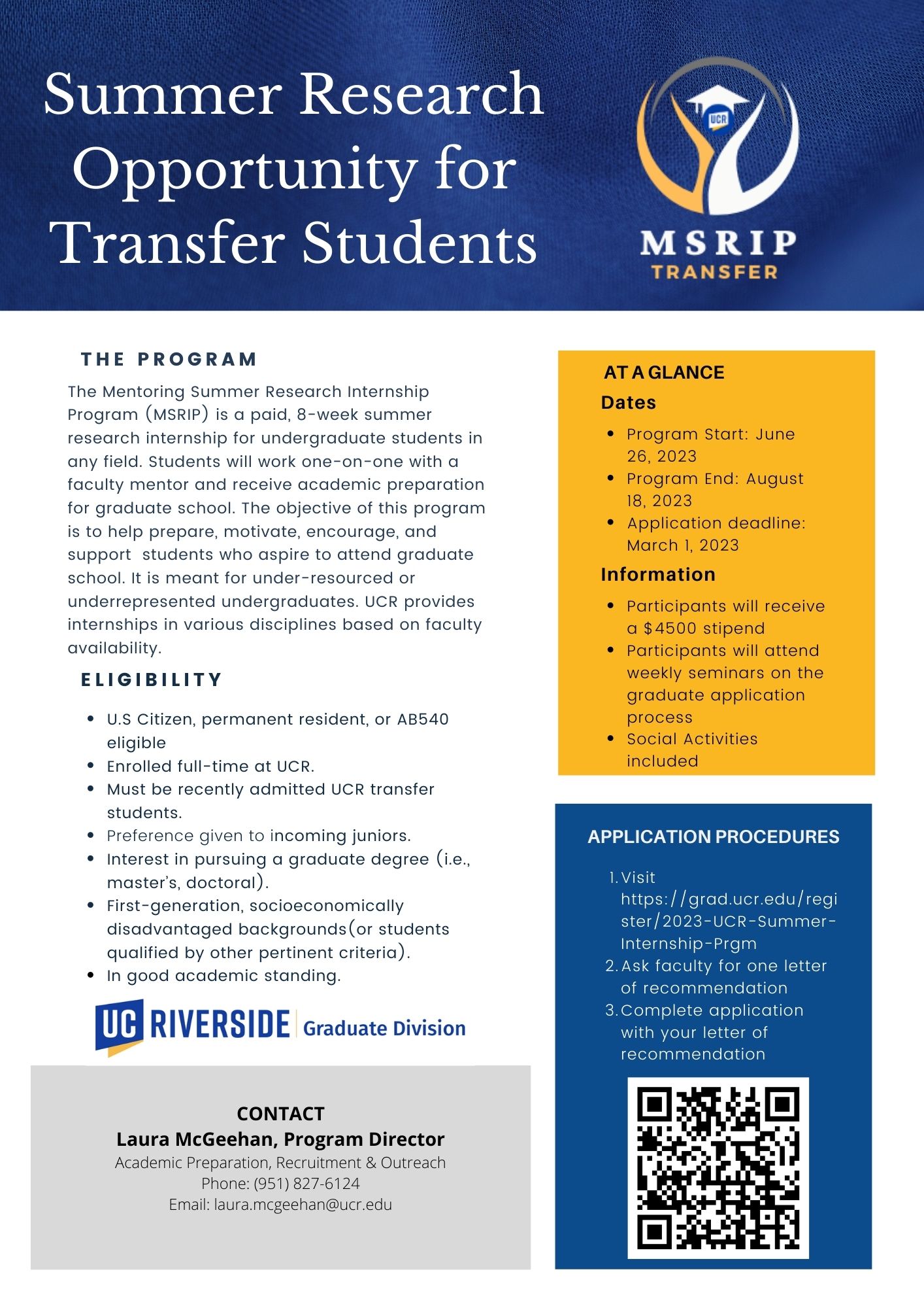 Please take a look at the information below and the attached flyer regarding UCR's Mentoring Summer Research Internship Program (MSRIP). They are looking to increase their transfer student participation. Visit MSRIP | Academic Preparation, Recruitment & Outreach (ucr.edu)<https://apro.ucr.edu/undergrad/msrip#program_provisions> for additional information and to apply.
