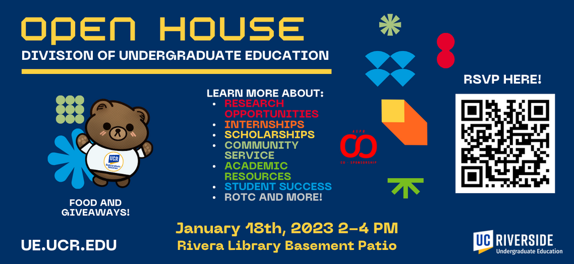 You are invited to the Division of Undergraduate Education's Open House TOMORROW, January 18th from 2-4 PM at the Rivera Library Basement Patio.