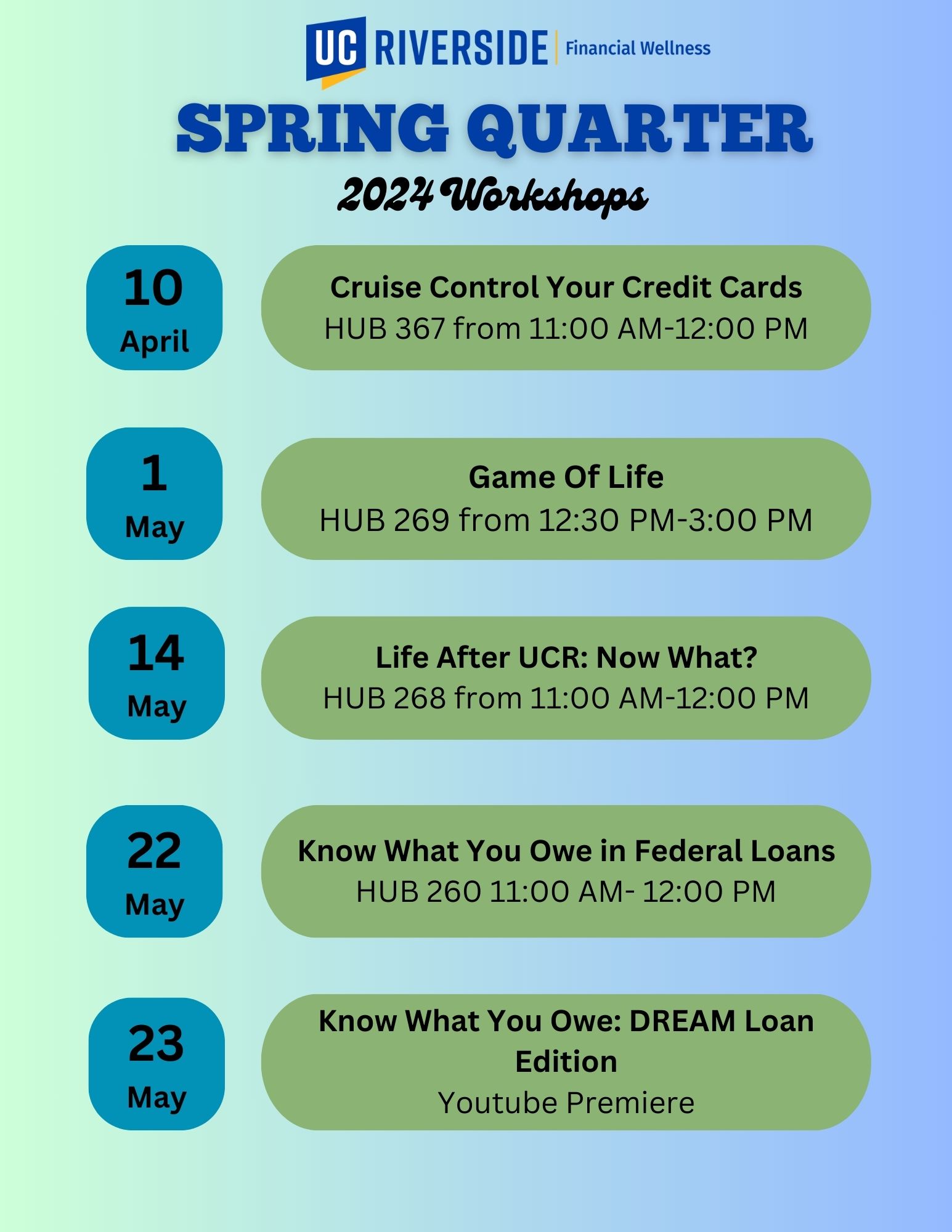 Happy Spring Quarter! Financial Wellness Program is proud to present our workshop lineup for this quarter, and I have attached the flyer to this email.