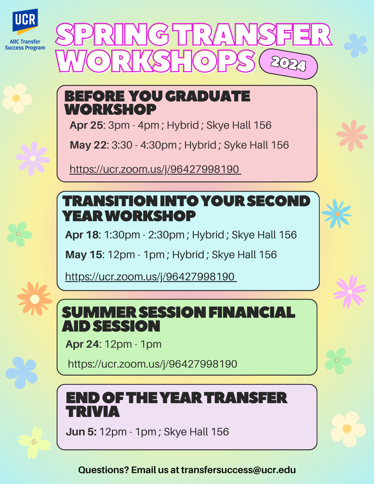 Supplemental Instruction (SI) & Tutoring – The ARC supports over 80 courses per quarter with SI and tutoring. The schedules for spring quarter can be found here: https://arc.ucr.edu/tap<https://c48e9.r.ag.d.sendibm3.com/mk/cl/f/sh/6rqJfgq8dIWBBvERgdOcg5IcJL4/mX8liBnEahkd> and https://arc.ucr.edu/si#schedule<https://c48e9.r.ag.d.sendibm3.com/mk/cl/f/sh/6rqJfgq8dIXqENWbAwoAbgQXwe6/5X3oyWqKXp23>.